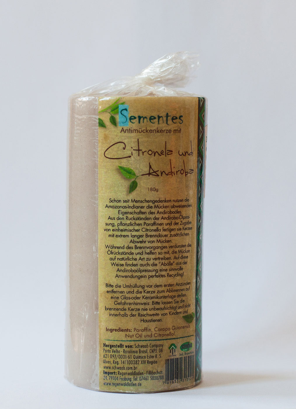 Neben der direkten Anwendung auf der Haut stellen die Waldbewohner aus dem Andirobaöl und pflanzlichem Paraffin eine Anti-Mücken-Kerze her. Mit dem bei den aktuellen Kerzen zugesetztem Citronella erweist sich das Gemisch bei der Mückenabschreckung als unschlagbares Duo. Beim Verbrennen verdunsten die Öle und helfen dadurch mit, auf natürliche und ungiftige Weise die Mücken zu vertreiben. Die Genralprobe im Frühjahr am Amazonas war überwältigend: Die Kerze ist speziell für Räume gedacht und brennt mit sehr kleiner Flamme, da sie am Amazonas in den Hütten und Häusern die ganze Nacht durchbrennt. Die kleine Flamme verlängert die Brenndauer und reduziert die Brandgefahr ohne die Wirkung auf die Mücken durch eine ausreichende Verdunstung von Citronella und Andirobaöl einzubüßen.