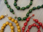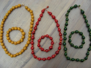 Ein Set aus Halskette und passendem Armband, hergestellt aus den geschliffenen und entsprechend eingefärbten Samen der Paxuiba- und Acaipalme, die beide am Amazonas heimisch sind. Die Sets gibt es in drei Farbvarianten: rot, grün und goldgelb. Im Bestellformular haben Sie vor dem Absenden die Möglichkeit, uns Ihren Farbwunsch mitzuteilen.